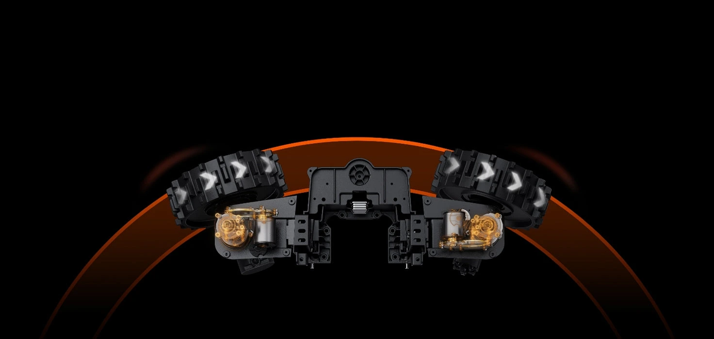 De maaier is uitgerust met een All-Wheel Drive (AWD)-systeem, waarbij alle vier de wielen worden aangedreven. In combinatie met onafhankelijke stuurmotoren zorgt dit voor optimale controle op uiteenlopende ondergronden. Oneffen terrein, kuilen, hobbels en opstapjes tot 7 cm vormen geen probleem.